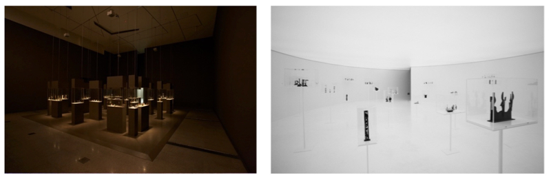 The soundscape, and its rising popularity in exhibition design, is widely appreciated for its immediacy and accessibility. Music and sound design influences how people feel, how they reflect, and how they recall memory and establish associations between other forms of communication (i.e. visual and spatial). In 2007, the NGV appointed a dedicated sound designer to concentrate upon this aspect of media production. In 2008, the NGV presented the work of Australian sculptor Robert Klippel at the Ian Potter Centre: NGV Australia (NGV, 2008; Walbrook and Chabrol, 2008). The exhibition featured a series of intimate small-scale sculptures of plastic and bronze across two distinct rooms of darkness and light (Figure 2). The environment was transformed into a self-generating interactive musical machine. The galleries featured an immersive soundscape distributed across an 8.2 channel surround sound system that responded to the verbal and physical response of visitors designed around a network of microphones, cameras, motion tracking technology, and dynamic audio processing software. Calypso motion tracking technology was used to interface with a custom-built DSP environment in MAX/MSP to record the movement and gestural behavior of visitors as they navigated the space. Incoming data was then interfaced with a suite of customized virtual instruments and rendered, in real-time, as a generative composition of delicate musical phrases and layered harmonics.