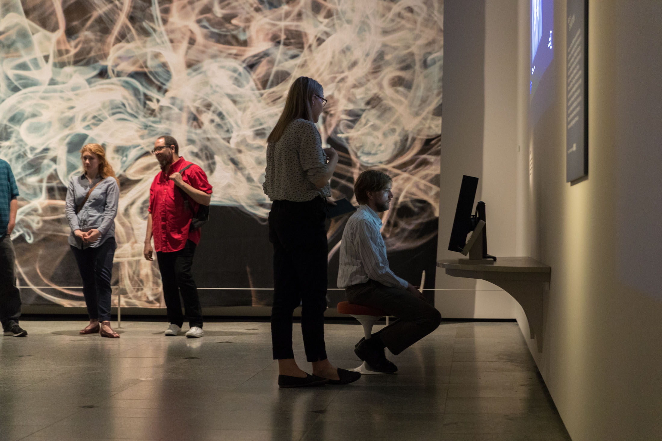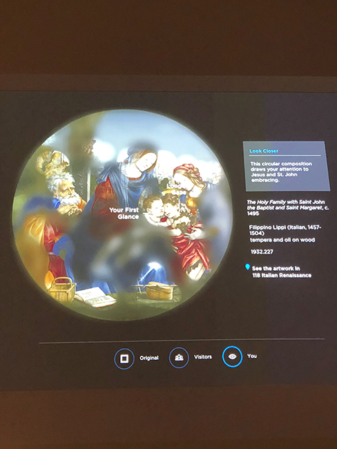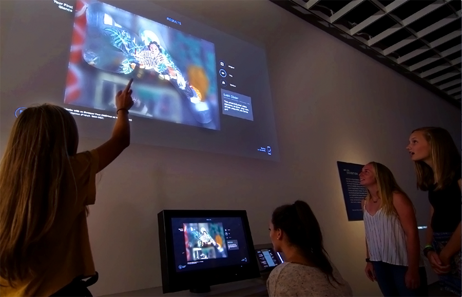 Gaze Tracker encourages visitors to explore the elements and artistic choices that impact the composition of an artwork. At Gaze Tracker, visitors sit in front of an ADA-compliant monitor, wait for the interactive to calibrate with their eyes, and look at an artwork from the CMA’s collection for 15 seconds. Innovative eye-tracking reveals with consistent accuracy where a visitor focuses when looking at the work of art, increasing the visitor’s understanding of how an artist’s compositional choices influence how they look at art. On a large video projection viewable by other visitors and on the individual monitor, the interactive shows visitors the path their eyes took while observing the work of art, including what grabbed their attention first, what detail they viewed the longest, and what elements they ignored. At the end of the interactive, visitors can see an interpretation of the artist’s intent regarding composition as well as the artwork’s identification, gallery location, and aggregate results from other visitors. The large video projection creates a social experience where multiple visitors can become involved to learn how others viewed the same artwork. Docking an iOS or Android device at the Gaze Tracker station saves all explored artwork directly to the “You” section of the ArtLens App via Bluetooth technology. Visitors can then use the app’s wayfinding technology to easily locate saved artworks in the galleries throughout the museum to view the actual artwork and access additional multimedia interpretive content.