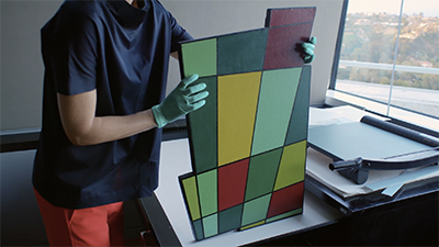 The video Painting in an Industrial Age looks at the extensive range of industrial paints the Concrete artists used to create perfect surface finishes or dazzling juxtapositions of glossy and matte paints. This array resonates with the context of rapid industrialization going on in Argentina and Brazil. The film also features the scientific research the Getty Conservation Institute and the Getty Research Institute conducted to determine the chemistry of these commercial paints.