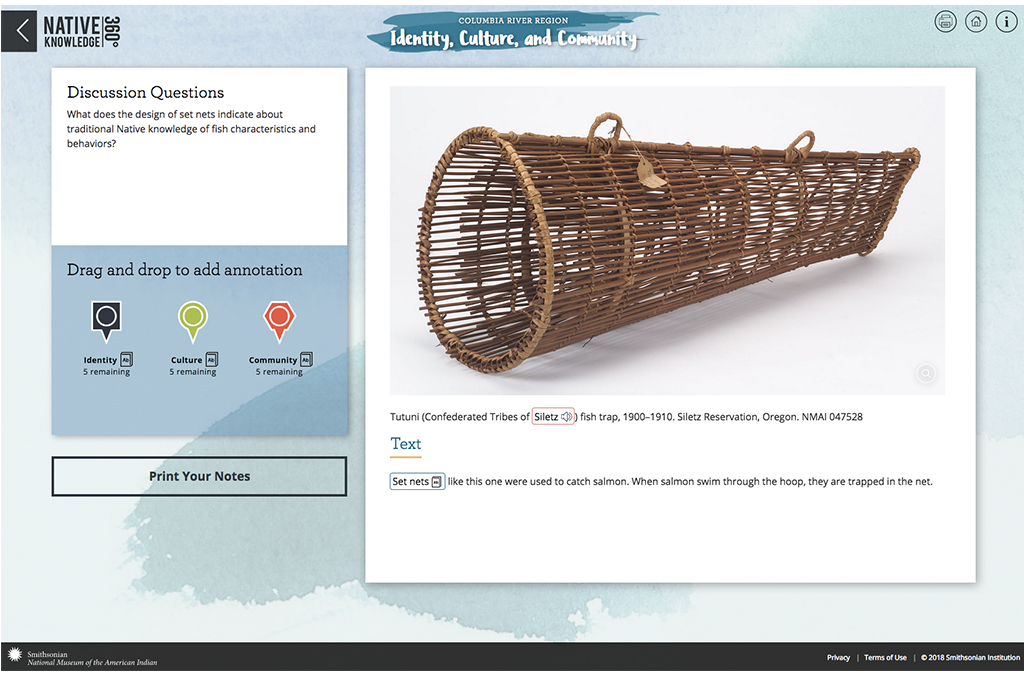 To anchor this work, the NMAI has created a Native Knowledge 360° website featuring multimedia classroom materials and educational programs to support interaction among teachers, students, Native leaders and educators, and the NMAI. Histories, traditions, and contemporary initiatives, as communicated by Native peoples themselves, are featured on the site, and complemented by objects and primary resources from the NMAI, to provide exciting classroom experiences for students and professional development opportunities for teachers.