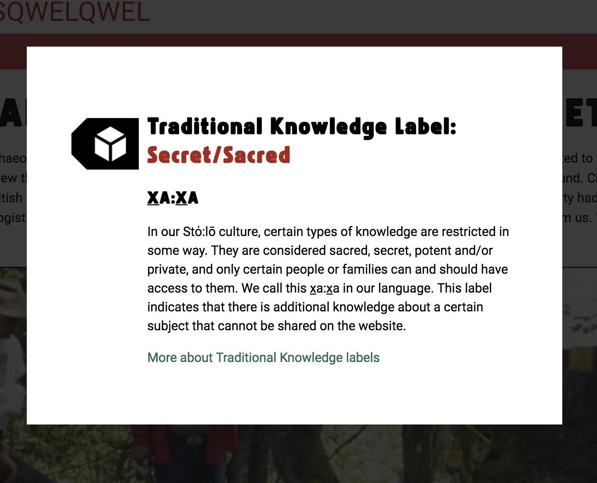 We also included an introduction to the Halq̓eméylem language and resources that this website provides, including a glossary of all terms used in the site and a pronunciation guide. We pilot the use of innovative Traditional Knowledge Labels that teach about ethical circulation of Sq’éwlets knowledge, and which reflect the different kinds of knowledge included in the exhibit, including culturally sensitive knowledge and oral histories with family ownership protocols.