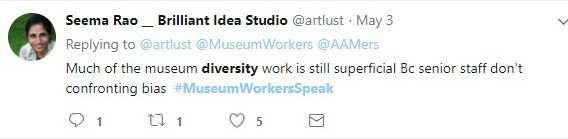 In recent years, and parallel to the previous discussion about audience engagement, the museum sector has been investigating the issue of diversity in the museum workforce. For example, a group of museum professionals carved the virtual space #MuseumWorkersSpeak to reflect upon the internal work of museums in relation to social justice issues including diversity, fair pay, and equal opportunity. The Twitter discussions created a much needed platform for critical thinking about museums’ practices, and the ways in which these practices encourage or discourage diversity. Overall, the minimal progress in workforce diversity has caused some frustration. Seema Rao, the Principal and CEO of Brilliant Idea Studio, made the following comment: