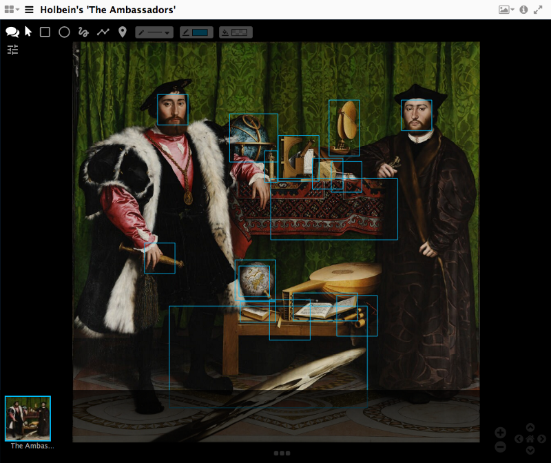 Figure 2: all the annotations used for the sample story, as shown in the Mirador viewer (White, 2017)