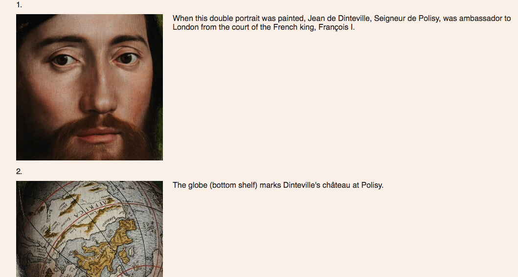 For the first and most basic example, we illustrate the result of rendering the combined annotation list and manifest into a basic HTML webpage to tell a story. The text that describes each image, region, or group of image regions is simply presented next to the appropriately cropped image region.