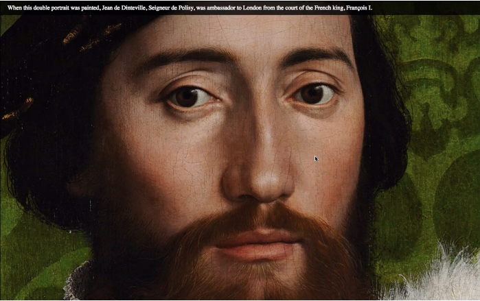 In this scenario, we deliberately take away control from the user to create a passive, immersive, and reflective experience. The user has no control, and instead must watch as the story of the painting slowly unfolds (ideally in full-screen mode to remove distractions). It would also be possible to convert this to a purely image-led experience by going so far as to hide the text panels: In that case, the annotations merely provide a list of interesting regions for the viewer to slowly pan towards.