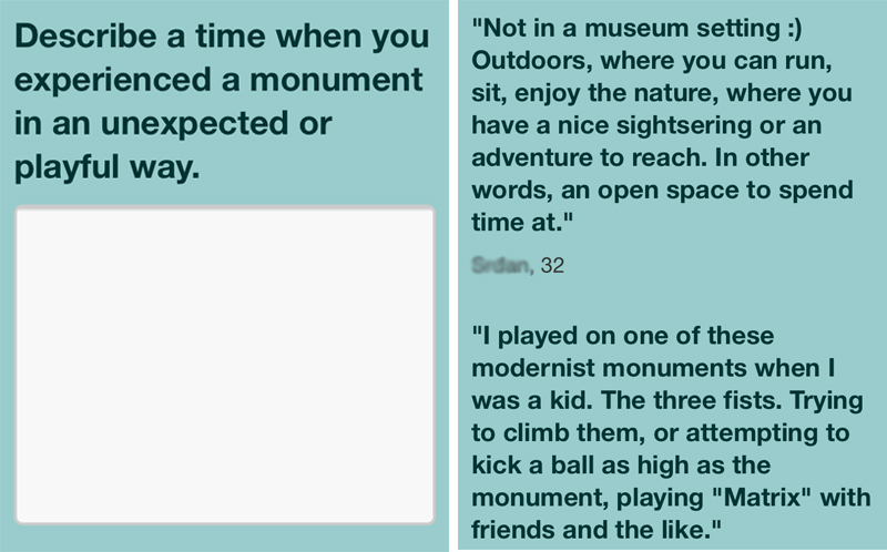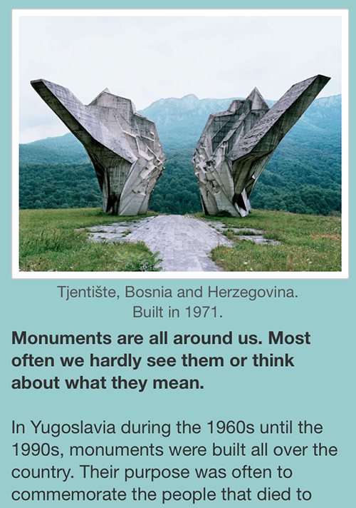 In our work with the design experiment, we searched for a theme that would serve as a critical point of entry to the Museum of Yugoslavia and its exhibitions, and which would open up a range of perspectives on the history of the former country. We found a suitable topic in the socialist monuments placed all over former Yugoslavia—internationally known as the “Spomeniks” (Surtees, 2013). These monuments are sites of ideological battles, and offer rich possibilities of interpretations. The subject matter of the monuments was discussed and further developed in a second workshop at the museum, after which we developed a prototype app.