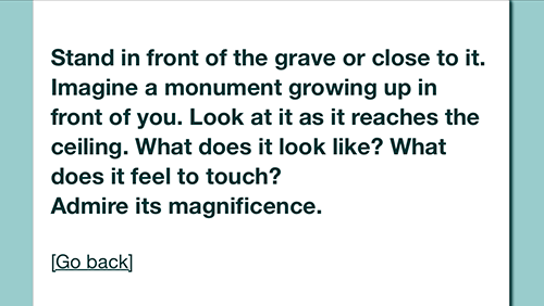 Building on Witcomb’s (2013) ideas on affective curatorial strategies, which encourages critical engagement with a historical topic, we presented the users with a series of poetic provocations. Our goal with these parts of the design was to invite a playful mindset which could trigger visitors’ imaginations, build attentiveness, evoke emotions, as well as facilitate reflection. The provocations were presented as playful challenges on the backside of a “challenge card” inside the app (Figure 6). They would prompt participants to put themselves in a specific state of mind, using their imagination and their bodies to interact with the museum environment. These challenges ranged from being lighthearted and playful to more emotionally challenging.