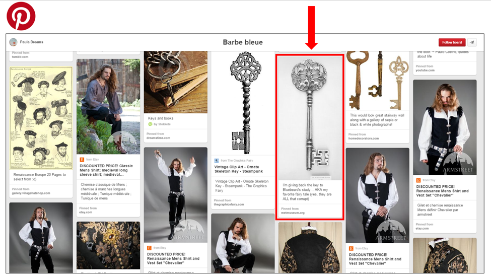 The reach of an object potentially increases when someone who visits the museum’s Online Collection shares this page or image on social media. The visibility of this object can increment even more when people on this social media site save it and continue the sharing chain. As a result of this, someone who stumbles upon this object while searching for a keyword or because of the content posted by followed users, may click on the original source, bringing this person to the Online Collection. This section will present the stories we found of people sharing content on Pinterest and how that brings traffic back to the website.