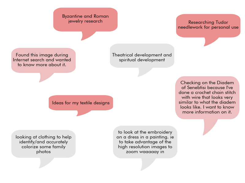 Pinterest is a significant traffic driver for both inspiration seekers and casual browsers. The survey targeting these users digs deeper into their specific motivations and the relationship with the museum. When users were asked about the main purpose of their visit there is clearly a high proportion of these users that are searching for visual content and inspiration for their own work that includes a range of artistic practices such as painting, crochet, jewellery making, fashion design or photography among many others (Figure 2). There are also users doing research mainly for personal purposes: looking for a wedding dress, decoration ideas or costumes for a play. There is also another group of users that are using this platform for learning purposes, for example to conduct research for their studies or to prepare a visual presentation for a class.