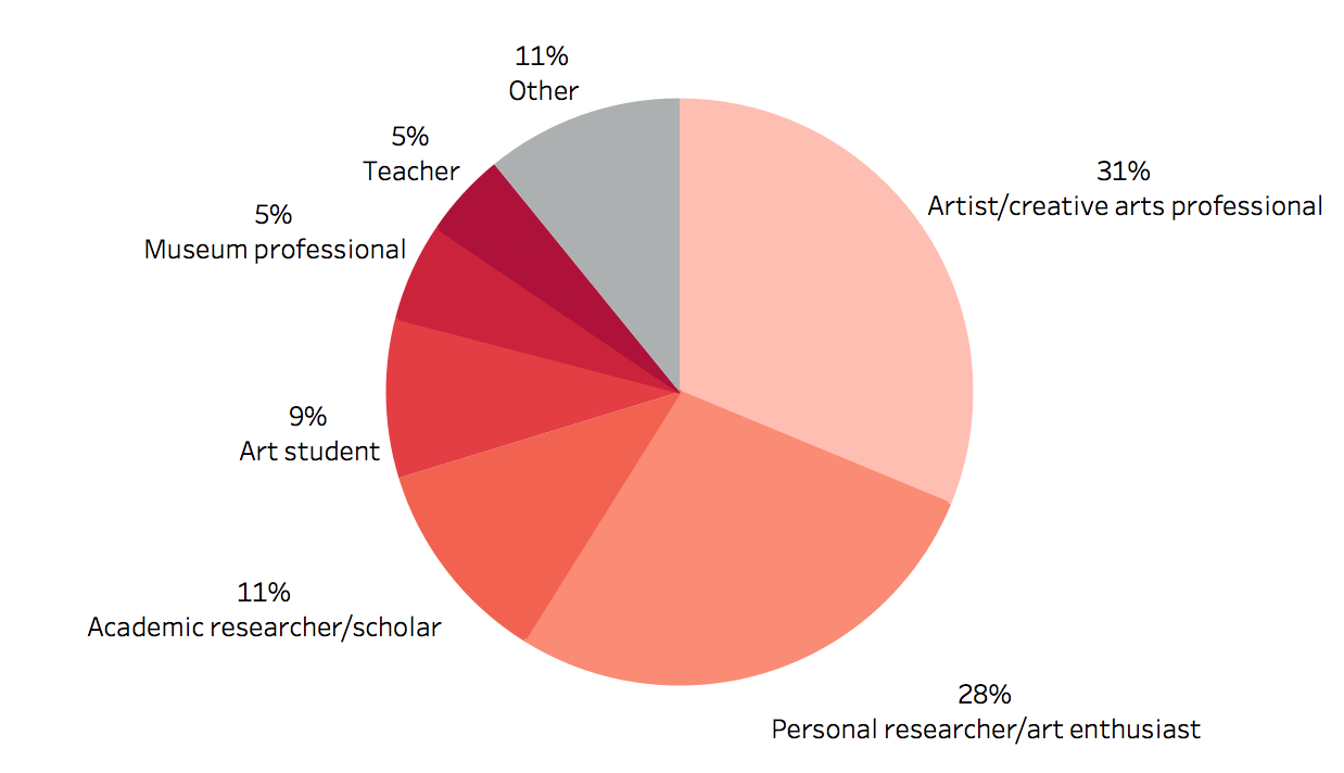 The type of users in these segments vary. The following chart shows how people describe themselves, which includes 31% of artists and creative professionals, 28% of personal researchers and art enthusiasts, and then, a bit more than a third of users that consist of academic researchers, students, museum professionals and teachers.