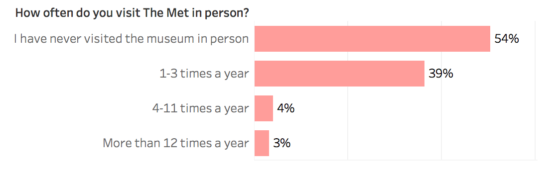 One of the goals of the survey was to understand the relationship with the museum. Figure 4 shows that 54% of Pinterest users that visited the Online Collection had never visited the museum in person, which brings an interesting insight about the impact of this platform reaching to new audiences and connecting with people located outside of New York who are interested in the museum.