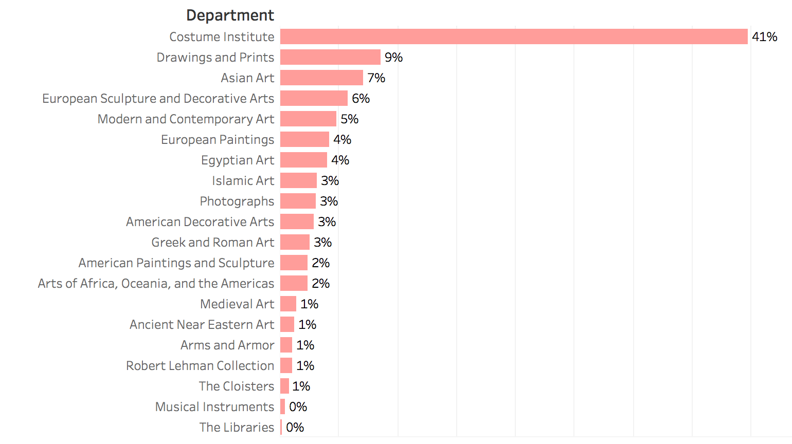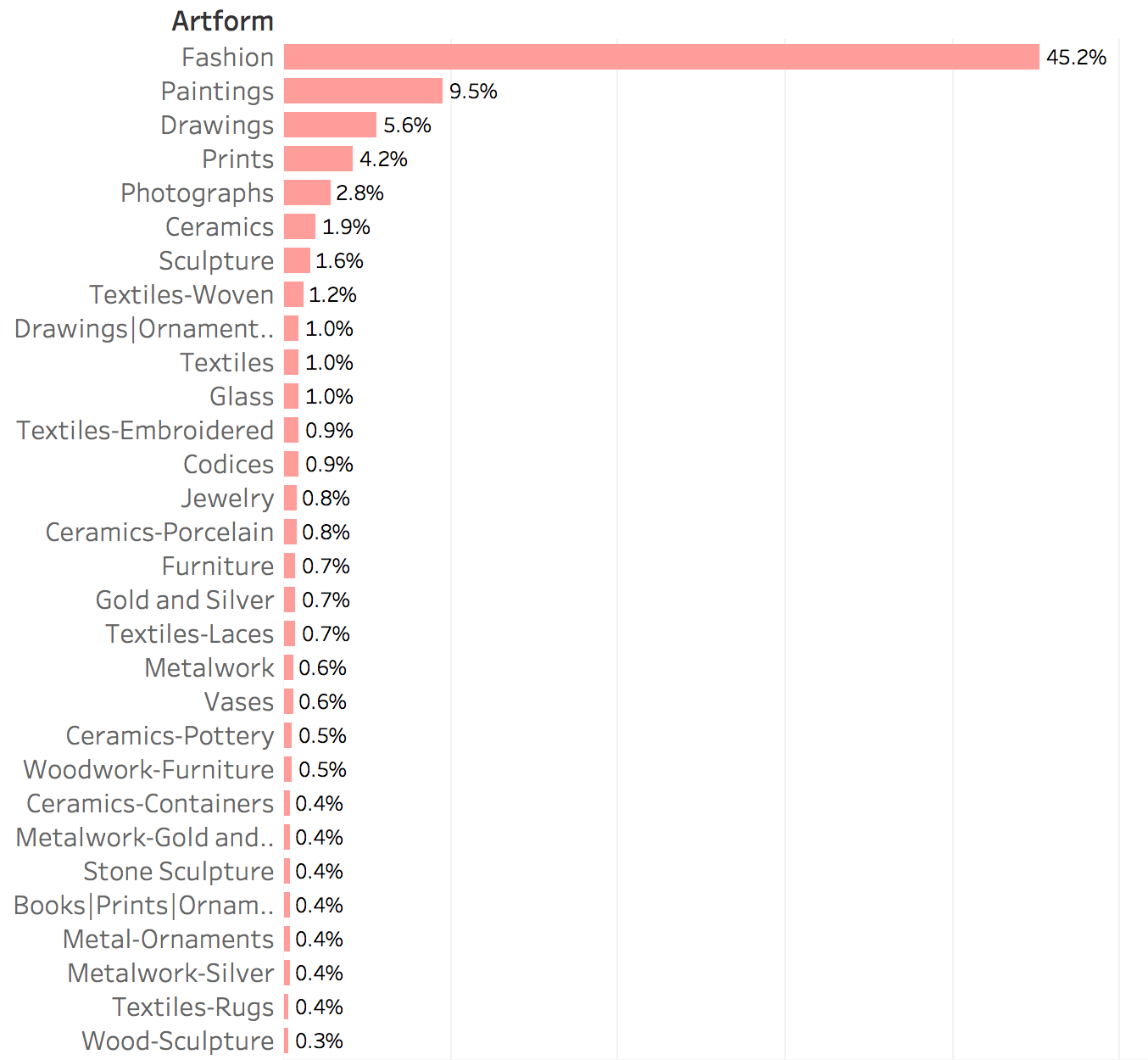 This section undercovers some of the stories of the sixteen thousand objects that were shared by users on Pinterest in 2017. An interesting fact is the fairly equal distribution of the number of times objects were shared on this site. The object that got the most shares was pinned 22 times but the majority of objects were shared just once. However, when the objects are grouped by department or artforms clear patterns appear on how popular Pinterest trends such as fashion, home decor or photography are reflected on the objects shares (Figures 6 and 7).