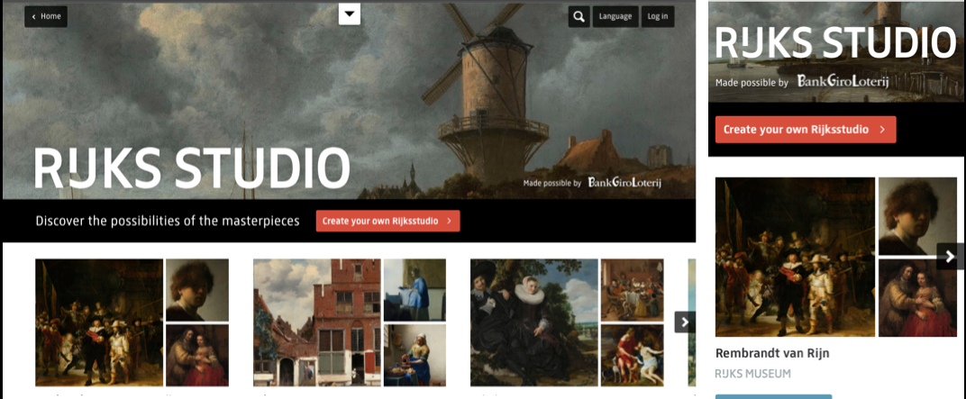 - Mobile first: Rijksstudio website and new Rijksmuseum app :Rijksmuseum in your pocket”: combining Rijksstudio, multimedia tours and tickets in one interface, developed between 2016 and 2018.