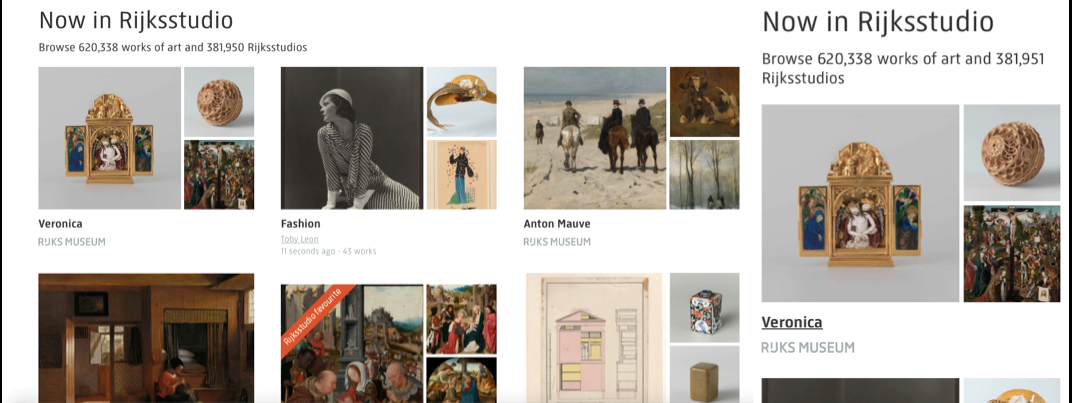 Figure 12: at the top of the Rijksstudio page we can see a carousel of entry points to Rijksmuseum sets, offering easy access to the collection to both art lovers and the general public. Here, we can see the three-column and the one-column versions of the template