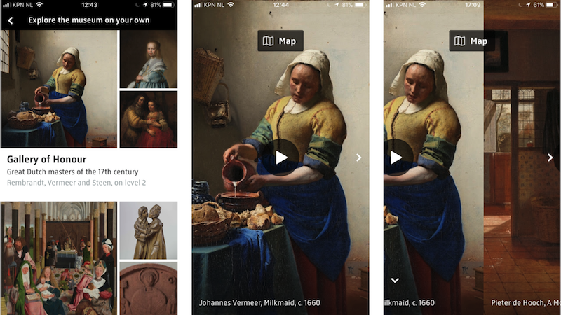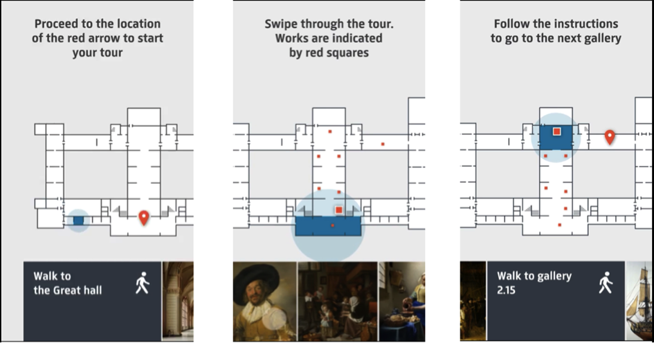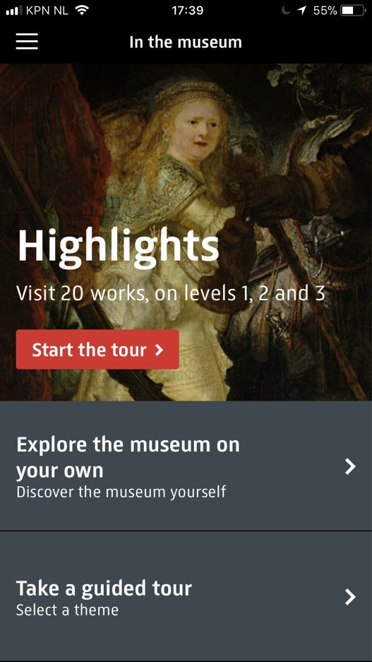 At the opening of the renovated Rijksmuseum in 2013, the Rijksmuseum launched the first version of its app including Multimedia tours, to guide visitors during their visit to the museum. The app offered information on more than 300 stops with three layers of content: an audio introduction, video and animations (see more), and in-depth audio by an expert (find out more).