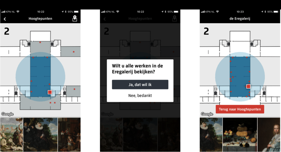 An important and innovative part of the new app is the indoor automatic wayfinding platform, powered by Dutch company Movin. This platform uses an interactive map and tailor-made automatic wayfinding directions for the museum site. The beacons can also be managed with this platform (including battery management, for example), but the platform also shows, by means of heat maps, which parts of the museum are busy or less busy.