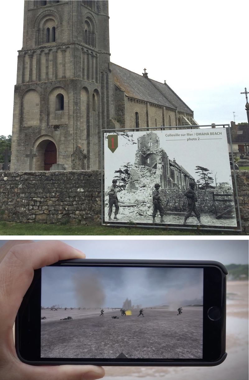 The combination of reinforcing and remembering is also present in the design of the augmented reality system, which we will describe and discuss in this paper using a reconstruction of the actions and events that unfolded on parts of Omaha Beach in Normandy during the first hour of the D-Day landing. The reconstruction is designed for use in situ, at the specific location where the assault actually took place on June 6, 1944, more precisely in the sectors of the beach codenamed “Easy Red” and “Fox Green.” (The Omaha Beach application was published on App Store in June 2017 and is available for free download. A short video of the system in use on location can be viewed online.)