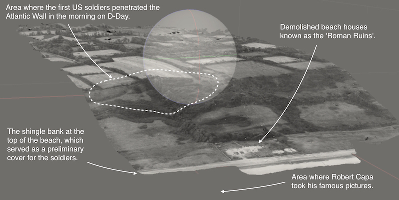 Shortly after the invasion, the Americans used the pebbles forming the shingle bank to strengthen the roads that led up from the beach. Since many of these photo series have sufficient overlap between individual images, it is possible to use software for photogrammetry to extract depth and create 3D-models of the original terrain. Based on the contemporary aerial photos, we were able to reconstruct the original shape of the crucial shingle bank, which served as a temporary but lethal cover for the soldiers before they ascended the bluffs. Examination of the aerial photos also show the extensive erosion that has taken place after the removal of the shingle bank. Below the German Wiederstandsnest 62 (WN 62), which serves as the suggested starting point for our reconstruction, the erosion has moved the high water mark more that 25 meters inland. Such topographical discrepancies between now and then, between the real and the reconstructed, are important circumstances that need to be considered in the design, and in how you inform the visitors/users about these types of changes.