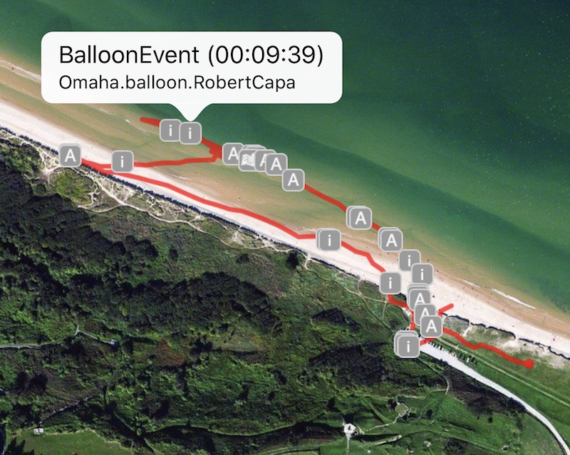 Figure 5: In the Tracker app the user’s movements are logged and shown on a satellite photo. Each grey icon represents an action in the app, accessing links, using global functions, pausing main sequence etc. In this case one of the information icons have been activated and informs us that this link was accessed 9:39 minutes into the session and the information accessed was about Robert Capa, which is located in the area where he captured his famous pictures.