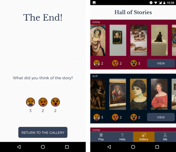 The first player is prompted to continue the story, the player photographs an artwork within the museum, finishes the previous sentence that the other player has written, and then starts writing a new sentence. The game switches over to the second player who is tasked with photographing a new artwork and continuing the story in the same way. Players continue to finish each other’s sentences and the game ends once each player completes five turns. The final story consists of 11 images and 11 sentences in total. At the end of the game, users can add a “reaction” to the story and post their story within the story gallery, which can be viewed by other players (Figure 2). The game also offers the option to share the player’s story on social media platforms.