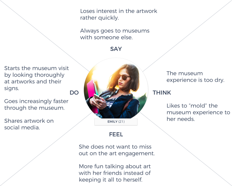 In order to support a rapid and agile process, we followed the “lasso toss” methodology described by Hedemann (2010) and constructed a provisionary persona on the basis of an interview with two museum visitors that matched our target group, the Socializers (Sachatello-Sawyer et al., 2002). Our two interviewees were female friends in their early 20s who enjoyed visiting museums with friends and were comfortable in using their mobile phones during the visit. One of the participants stated that if an artwork reminded her of someone, she would sometimes use her phone to take a picture of the artwork and send it to her friend. Figure 3 shows an empathy map of the persona that motivated the design of Word by Word, constructed on the basis of these interviews, our observations at the museum, and the pre-existing literature.