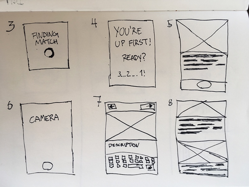 The second set of prototypes focused on developing and improving the game’s user experience. These initial prototypes were in the form of paper wireframes (Figure 3) that show a design heavily inspired by Instagram and Snapchat. A decision was made to adopt the design and conventions of these apps into Word by Word so that users would be familiar with them. These conventions—such as the use of full-screen imagery for the artworks accompanied by transparent text overlays for their captions—were intended to focus the user’s attention on the artwork and their captions, while providing a sense of familiarity based on conventions established by popular social media applications. The design of Word by Word was initially implemented as paper, and then clickable prototypes, and then finally implemented as a working version of the application.