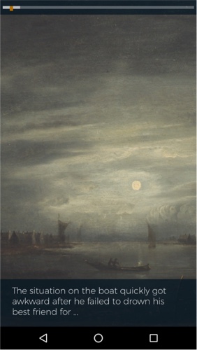 The game is designed to be played by two or more players, where players collaboratively build a story that features the artworks they see around them in the National Gallery of Denmark. To begin, one of the players selects a theme—either crime, fairy tale, or science fiction—and then the game pairs up the participants and selects a starting player. From that point, a story starter (Figure 1) is shown. The story starter consists of an artwork from the National Gallery of Denmark, along with an incomplete sentence fragment that the starting player needs to finish. The story starter is designed to establish the narrative and tone of the collaborative story that is based on the selected theme.